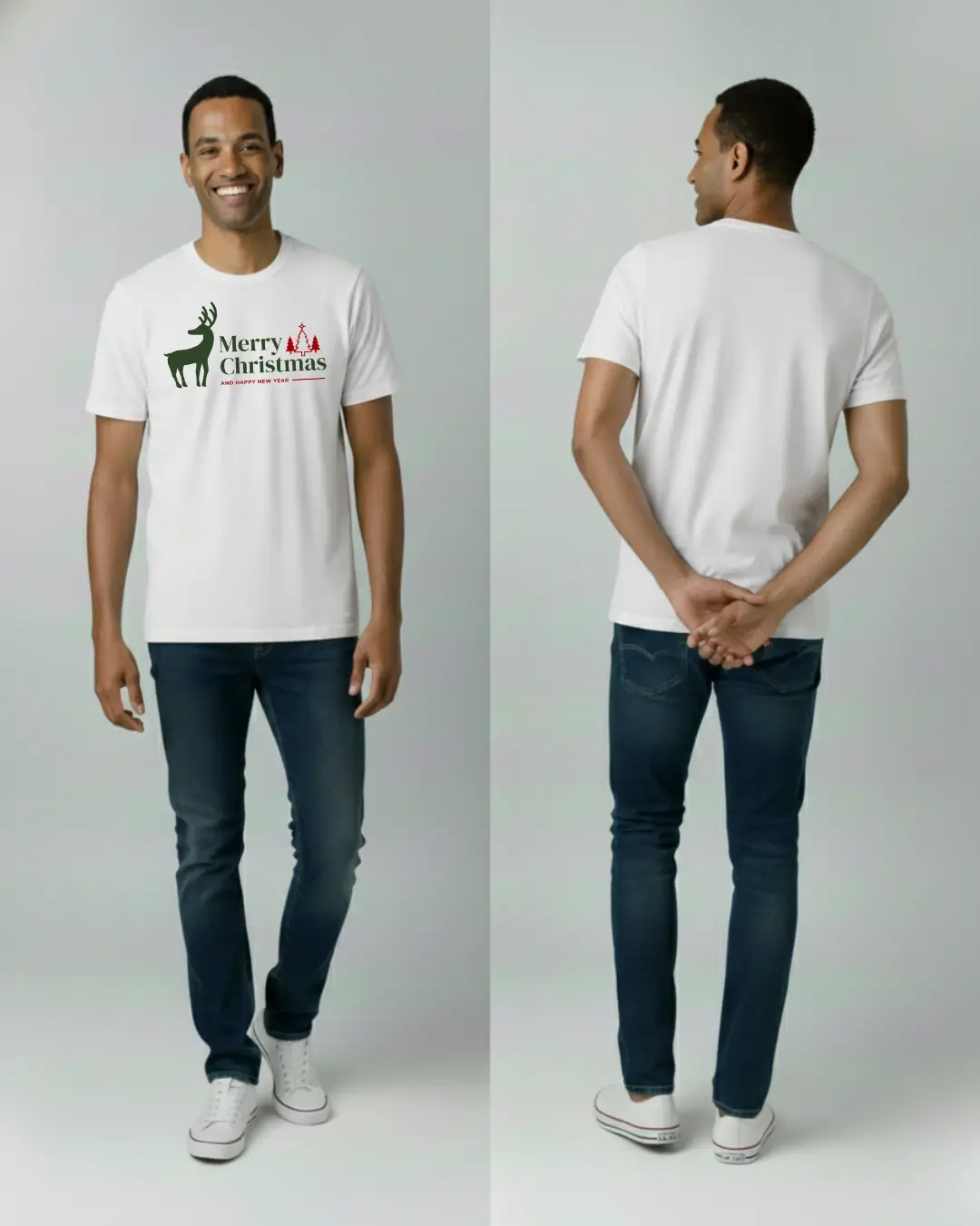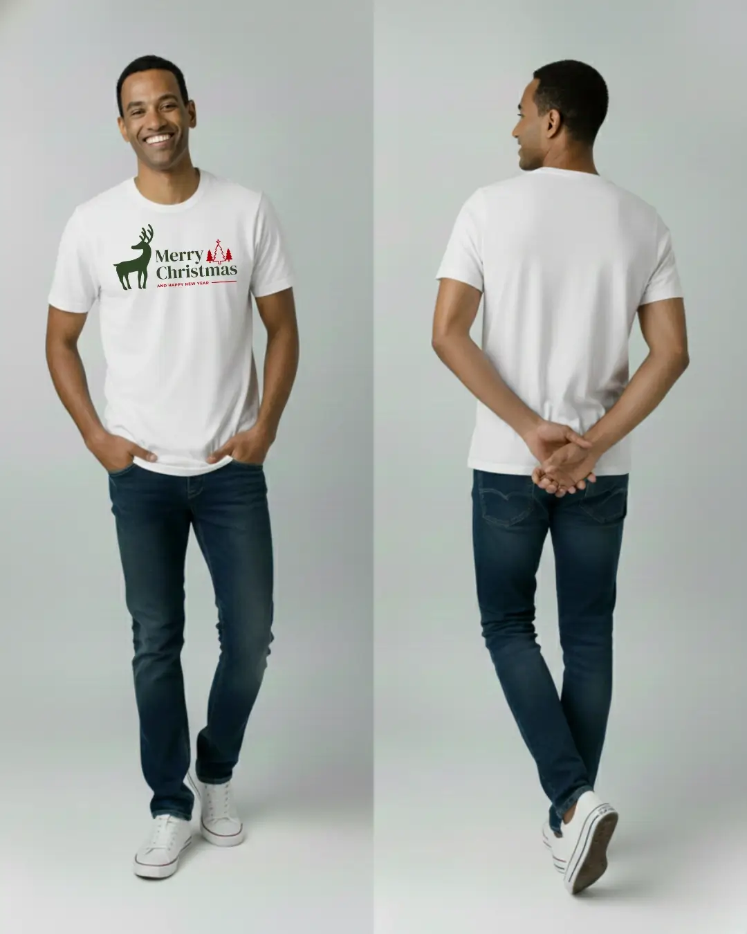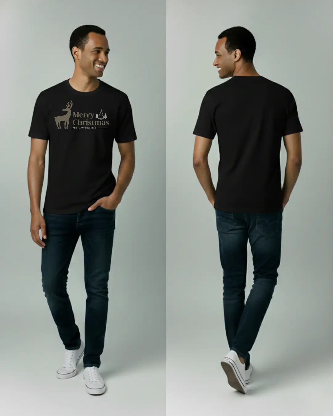 A clean and festive T-shirt featuring a reindeer silhouette alongside “Merry Christmas and Happy New Year” text with decorative tree graphics. This minimalist holiday design sits on the front chest area, offering a subtle seasonal statement. This Regular Fit tee is made in Sri Lanka to export-ready standards, crafted from a soft cotton blend that provides comfort for holiday gatherings and everyday casual wear.