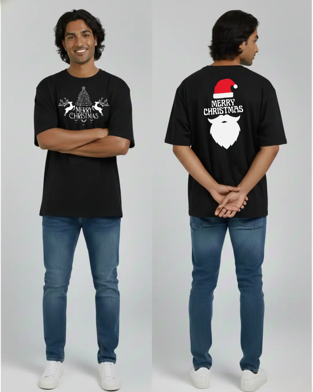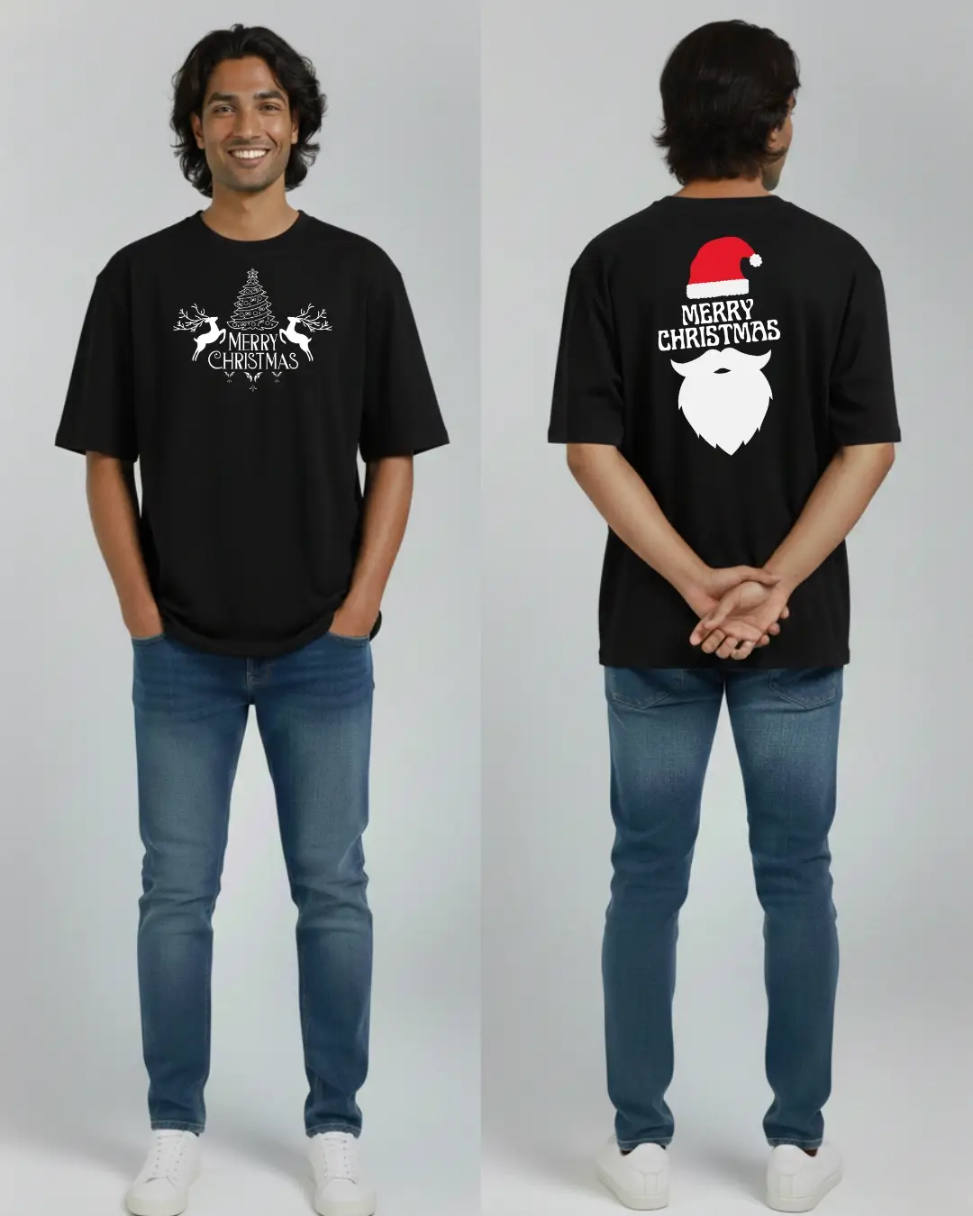 A festive T-shirt featuring a symmetrical design of two reindeer flanking a decorated Christmas tree with “Merry Christmas” text on the front. The back displays a bold Santa Claus beard silhouette with his iconic red hat and “Merry Christmas” text, creating a playful holiday statement. This Oversized Fit tee is made in Sri Lanka to export-ready standards, crafted from a soft cotton blend that provides comfort for seasonal celebrations and casual wear.