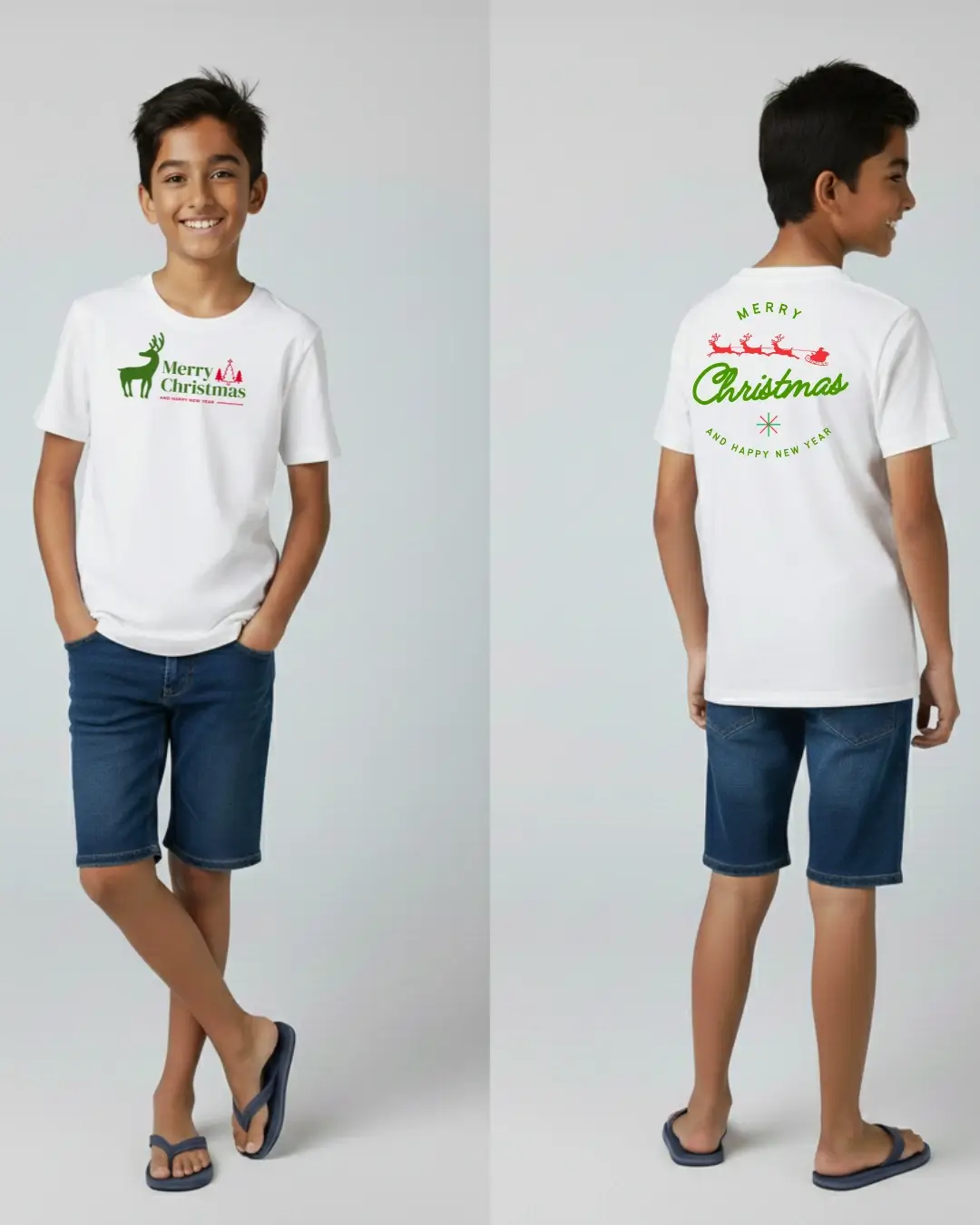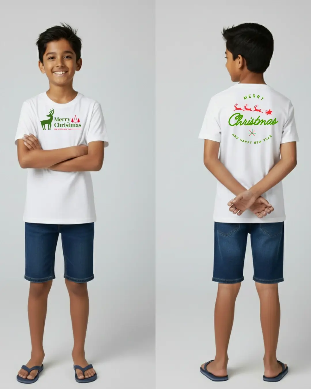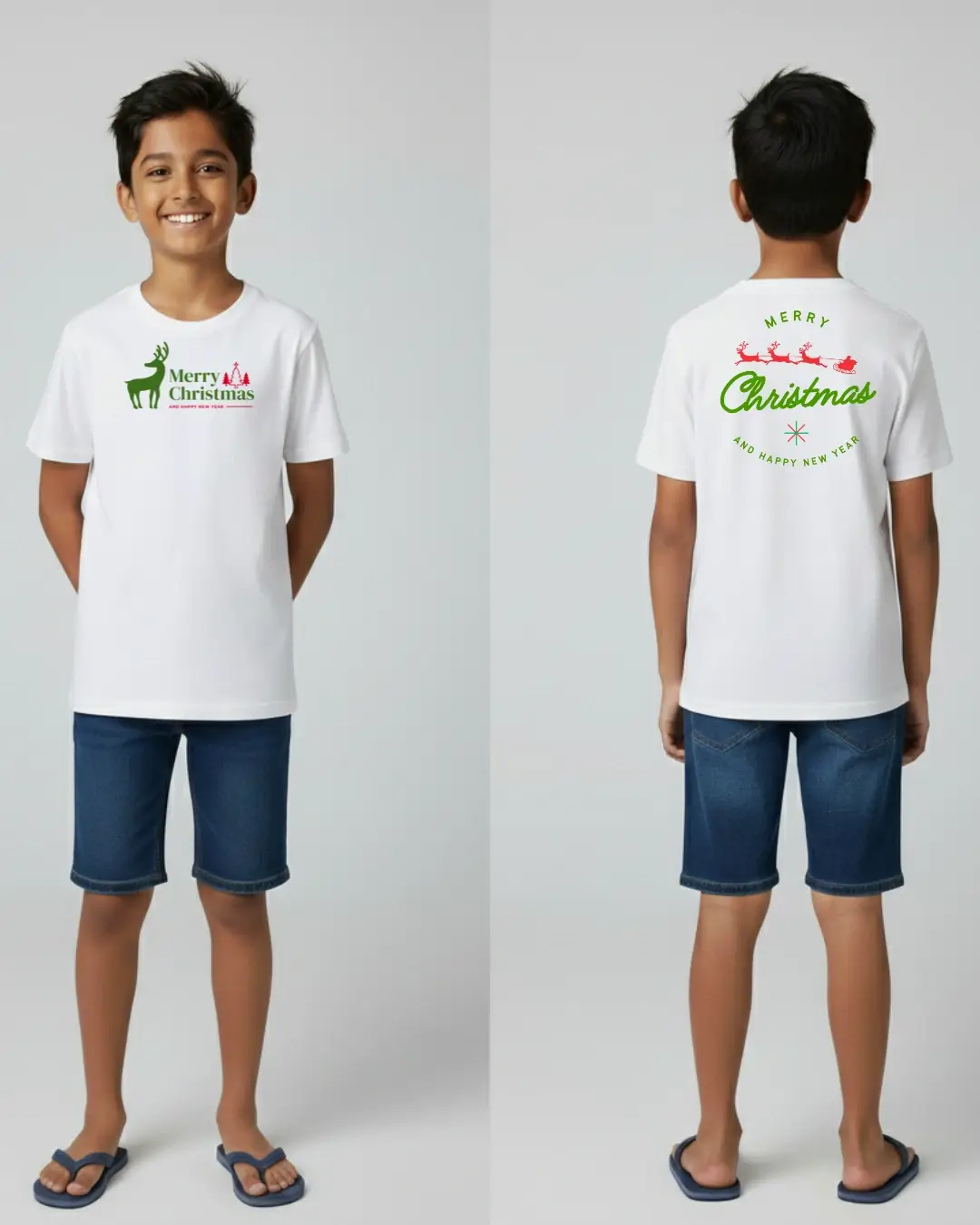 A festive T-shirt featuring a reindeer silhouette alongside “Merry Christmas and Happy New Year” text with decorative tree graphics on the front. The back displays “Merry Christmas” in green script lettering with Santa’s sleigh pulled by reindeer above, surrounded by stars and “and Happy New Year” text below. This Regular Fit tee is made in Sri Lanka to export-ready standards, crafted from a soft cotton blend that provides comfort for boys during festive celebrations and everyday wear.